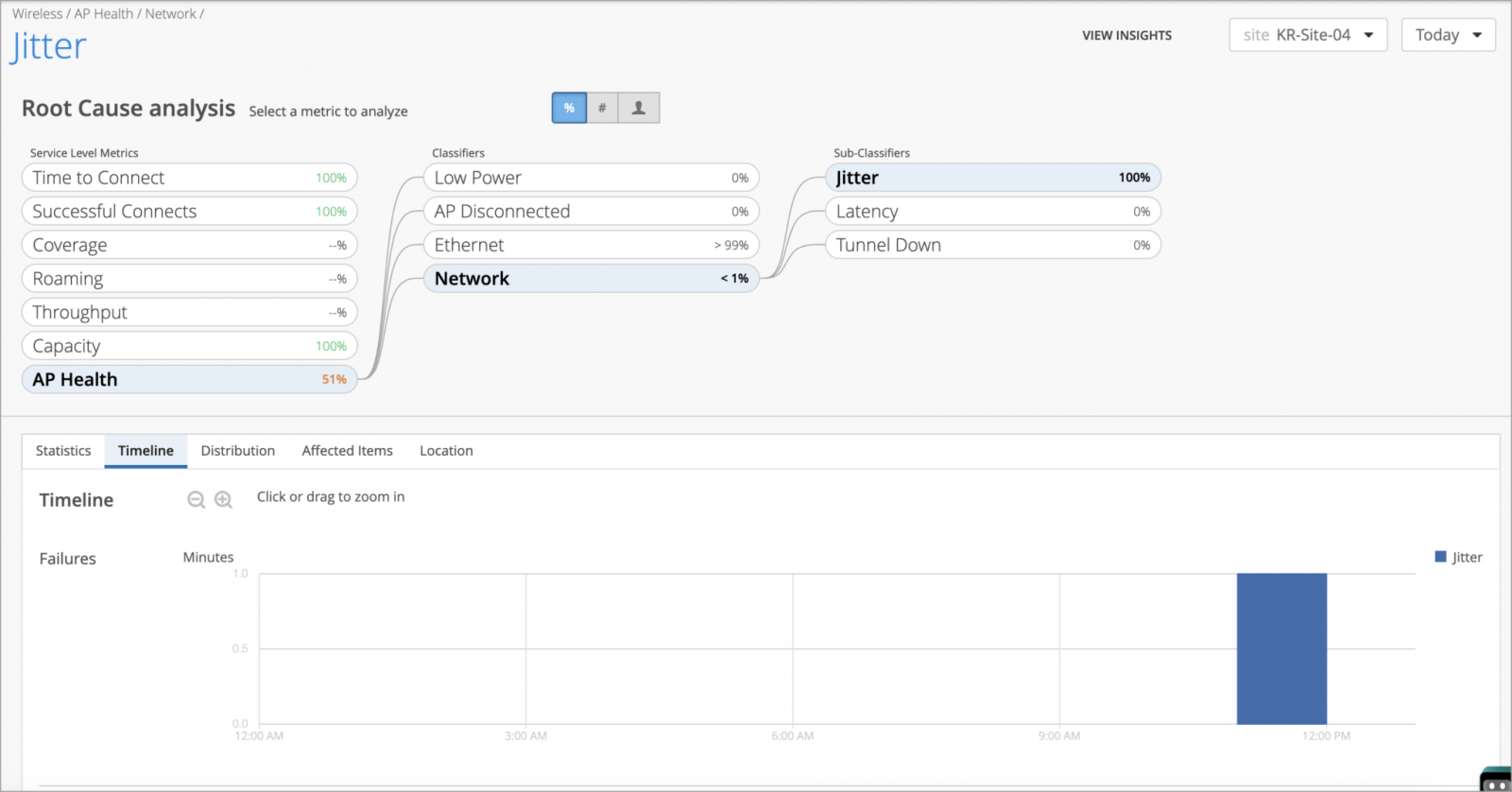 Jitter – Indicates when there is inconsistent round trip latency between the AP and the Mist cloud