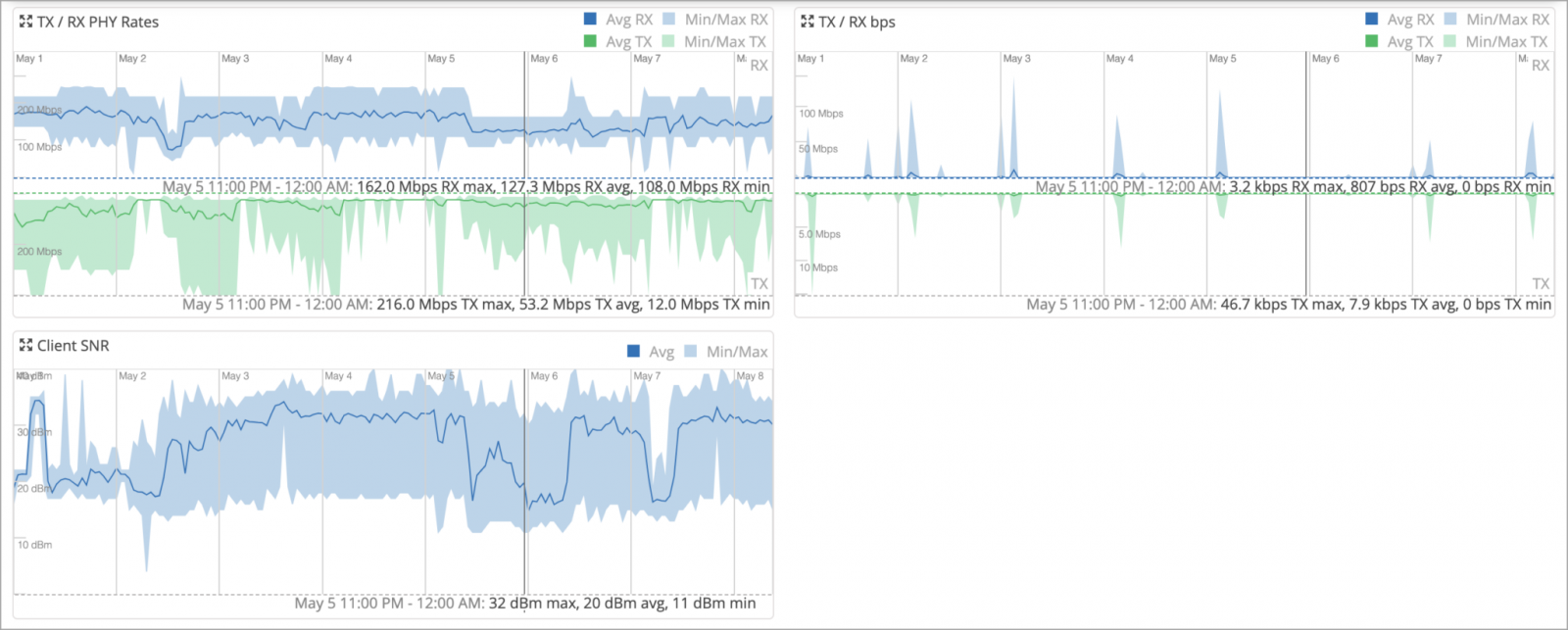TX / RX PHY Rates—Shows the minimum/maximum/average Tx (transmit) and Rx (receive) signals rate (PHY rate) on the selected client. The PHY rate refers to the actual signaling rate at the physical layer of the network interface.
